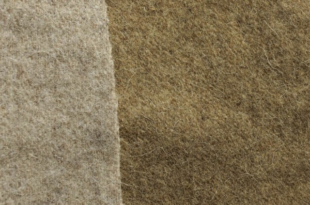 Pour le tissu destiné à mon manteau, j’ai utilisé de la gaude sèche en poudre, même méthode fastidieuse et qui donne très chaud, mais j’ai ajouté peu à peu une solution de sulfate de fer assez concentrée pour faire virer le jaune gaude au vert que je recherchais! L’ajout de sels de fer doit se faire petit à petit, car on obtient souvent de manière très rapide un virage de la teinte, quand la concentration atteint un certain seuil… j’aurais voulu, là aussi, un vert plus profond, mais c’était un premier essai, avec une méthode qui demande bien des améliorations! 😉