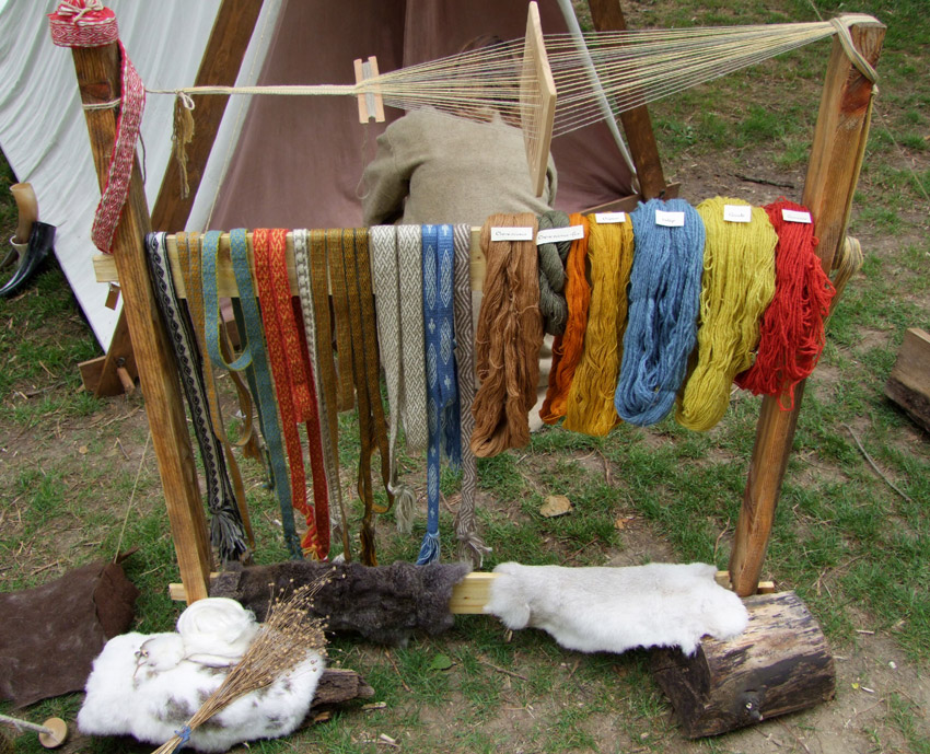 J’avais amené des galons, de la laine teintée aux plantes, de la laine peignée, un fuseau, du lin peigné, un peigne et mon métier pas histo mais bien pratique pour faire de la démonstration en public! Comme d’habitude, je ne suis pas derrière des cordes, mais au plus près du public, qui peut regarder de près, toucher, même essayer (génial pour les gamins!).