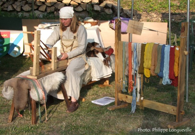 J’ai été invitée à faire une démonstration de tissage au donjon d’avrilly, une motte féodale dans l’Eure (http://www.donjondavrilly.fr/index.htm) lors d’un feu de la Saint Jean. Le public était venu en nombre, mais mes explications étaient malheureusement quelque peu « couvertes » par la musique! Et beaucoup de personnes sont venues tard, sans doute pour échapper à l’écrasante chaleur qui régnait encore au début de la soirée…
