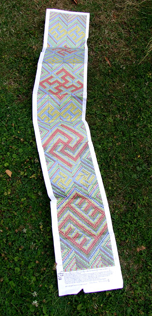 Au début de cette année, je m’étais mise en tête de tisser le « fameux » motif à quatre couleurs dit « Snartemo » (du nom d’une localité où ont été faites des découvertes archéologiques en Norvège, datant de la période dite « des migrations », vers 500 après J.C.). Il y a plusieurs versions de cette magnifique pièce en vert, jaune, bleu et rouge, utilisant la technique « à fils flottés ». J’avais trouvé sur le site de Flinkhand un diagramme au format PDF qui me semblait relativement clair (et qui tient sur 5 pages A4…):