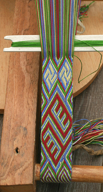 J’avais tenté l’aventure il y a quelques mois mais pour une raison qui m’est toujours obscure, je n’avais jamais réussi à commencer… j’avais fait, raté, défait, changé l’enfilage, retourné l’ouvrage, bref… une horreur!! cela m’avait tellement énervé que les 40 tablettes avec les fils ont finies à la cave dans un coin. Mais finalement, prenant mon courage à deux mains, j’ai repris ce motif infernal et j’ai réussi à le commencer! L’explication donnait comme indication de faire l’enfilage en « S » et d’arranger les couleurs dans le sens des aiguilles d’une montre: vert, rouge, bleu, jaune. Moi quand on me dit « dans le sens des aiguilles d’une montre », je me dis que c’est en regardant mes tablettes « de face » (c’est à dire de la gauche quand elles sont montées sur le métier!), mais en fait, ça ne collait pas du tout avec la théorie (gratgrat…) et du coup c’est, selon ma logique, dans le sens inverse des aiguilles d’une montre qu’il fallait enfiler les couleurs! 😀