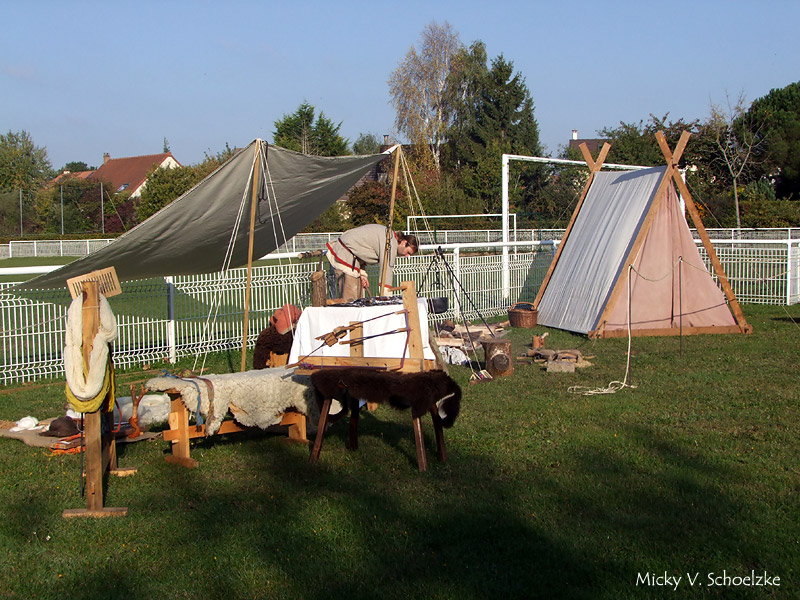 Quelle idée d’aller passer la nuit en campement au mois d’octobre, alors que des températures proches du zéro sont annoncées! Le vent était froid et nous envoyait de la fumée et des cendres du feu dans la figure toute la journée de ce dimanche glacial! Pour moi, la journée a mal commencé avec la casse d’une de mes tablettes en bois, mais ensuite j’ai pu tisser tranquille, en me réchauffant de temps à autre les doigts près du feu!