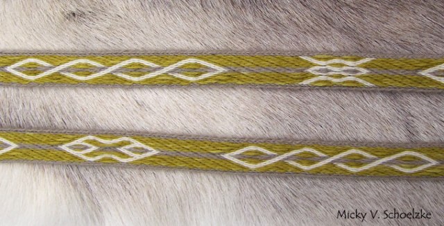 Au final, la pièce (je ne sais pas encore à quoi elle servira, galon ou ceinture??) fait 2m13 et environ 2cm de large (tissée avec 19 tablettes, 15 pour les motifs et 2 de chaque côté en bordures). La laine est teintée écorce de chêne + fer (vert plus foncé) et gaude+ fer (vert tirant sur le jaune).