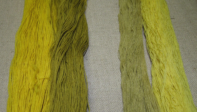 A gauche, de la laine 4 brins et à droite le fameux mélange lin/laine (comme je le pensais, les teintes sont moins vives sur le mélange!). Le jaune est obtenu avec la gaude, on passe au vert en mettant l’écheveau teinté à la gaude dans un bain de sulfate de fer (mais je ne laisse jamais la laine très longtemps dans ce bain, car c’est assez aggressif pour la fibre, et la laine deviendrait trop rêche et parfois cassante!).