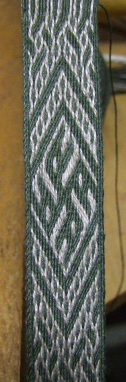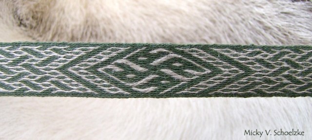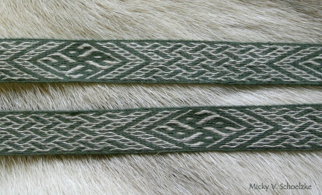 J’ai utilisé du lin vert foncé et naturel (non blanchi). Le motif est formé avec quelques flottaisons de fils, le reste du galon entre les grands motifs sera typiquement d’inspiration Birka, avec un joli aspect « tressé » :