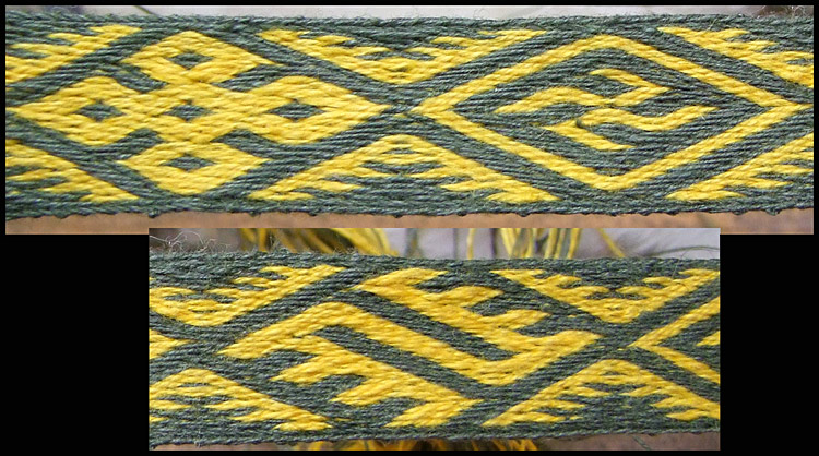 Ce motif est constitué de 4 éléments qui se répètent: une « croix » puis une petite swastika, un élement décoratif « en peigne » rappelant certains motifs de Snartemo suivi d’une autre swastika et ainsi de suite… La technique utilisée est le sergé (Köper ou 3-1 twill). Je l’ai commencée en lin avec des couleurs très contrastées pour faire ressortir les motifs. maintenant, il faut que j’arrive à adapter ma tension de fils pour éviter que les motifs ne « s’étirent » trop, mais je suis déjà assez contente du début! 😉