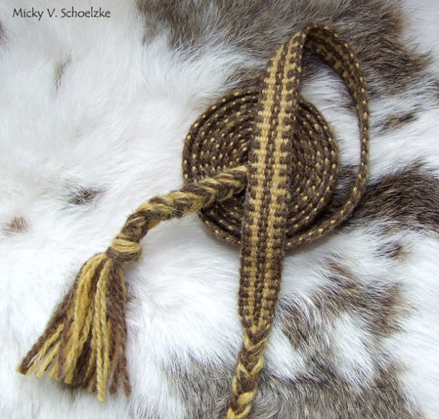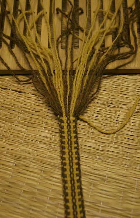 Le tissage au peigne donne un galon beaucoup moins épais que le tissage tablettes, vu qu’il n’y a que deux nappes de fil et aucune torsion. Les possibilités de motifs sont également assez réduites, mais c’est récréatif ! Il me restait de la jolie laine brune de moutons du Jura et je lui ai associé une laine filée main teintée oignons.