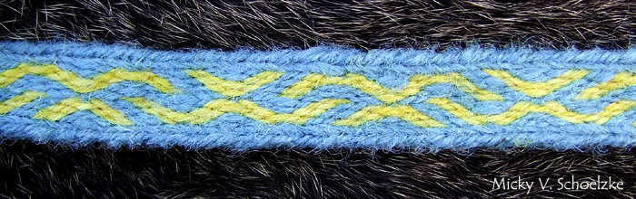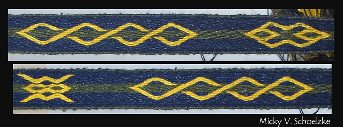 L’autre comporte des motifs de Mammen (Danemark, Xème siècle). J’avais déjà tissé les motifs de Mammen et j’avais envie de les tenter en lin. J’ai utilisé des couleurs qui « claquent », le résultat est plutôt sympathique et les flottaisons inévitables en sergé se voient moins que sur mon premier essai en laine! Cela donne un galon d’une grande finesse que je verrais bien sur le costume d’un scandinave très « chic »! 😀