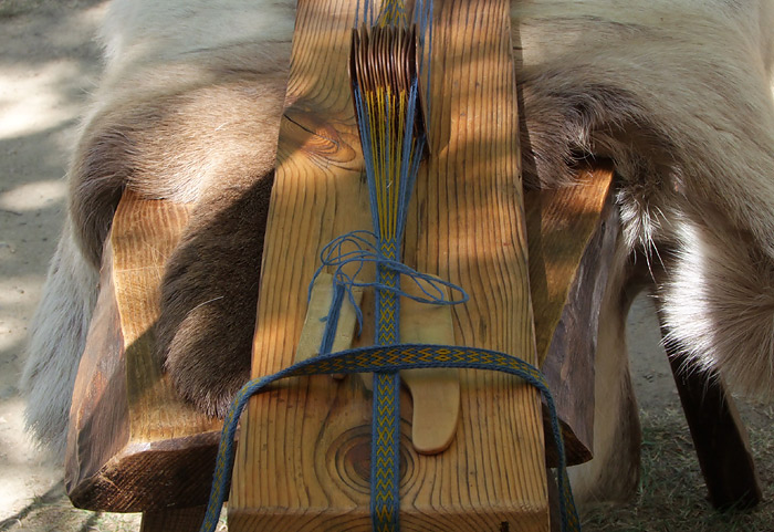 J’avais, comme d’habitude, emmené un métier à tisser aux tablettes, je n’étais pas la seule à proposer cette activité pour une fois, mais chaque tisserande a sa technique et son matériel de toute manière! Pour ma part, j’avais choisi de montrer un motif historique norvégien en technique « missed-hole » (deux fils par tablette) avec ma planche à tisser: