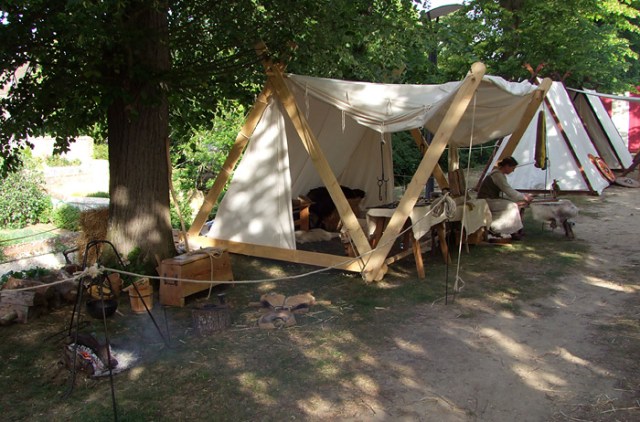 Notre campement commence à être mieux agencé, avec notamment un nouveau coffre, un nouveau trépied forgé (réalisations de Philippe Longueville) et une nouvelle tente-échoppe plus grande: