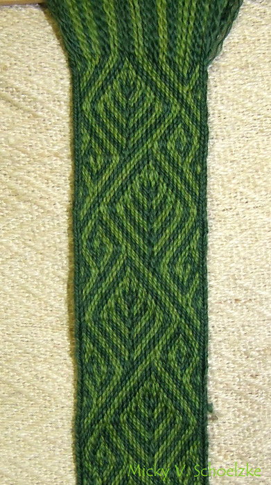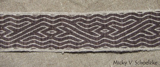 D’abord un motif d’après une bordure de tissu d’autel du XIème ou XIIIème siècle (Halberstatt, Allemagne): impossible de trouver des infos plus précises sur ce motif, mais c’est joli! :-). réalisé avec 36 tablettes et en fil de lin (que c’est raide, le lin, je crois que je préfère la laine!!).
