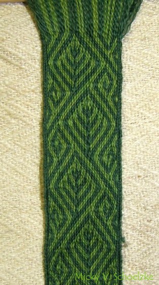 Ensuite un motif que j’avais trouvé par hasard sur un site estonien et dont Sonja die Wollhex m’a gentiment procuré le diagramme!! Une pro qui partage ses infos et ses diagrammes, c’est assez rare pour être mentionné! Réalisé en laine mérinos teintée sureau+indigo et gaude+indigo avec 34 tablettes: