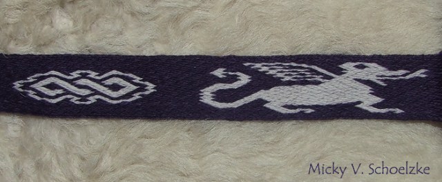 il s’agit de motifs isolés inspirés des pièces de fouilles d’Humikkala (XIème siècle, ) et Snartemo (VIIème siècle, Norvège). Je les ai mélangés dans cette pièce, de toute façon, beaucoup de motifs nord-européens du haut Moyen-Age ont des similitudes (il suffit de comparer les pièces de Humikkala, Snartemo, la ceinture de Bertille de Chelles, celle de Saint Donat etc.) pour s’en apercevoir!