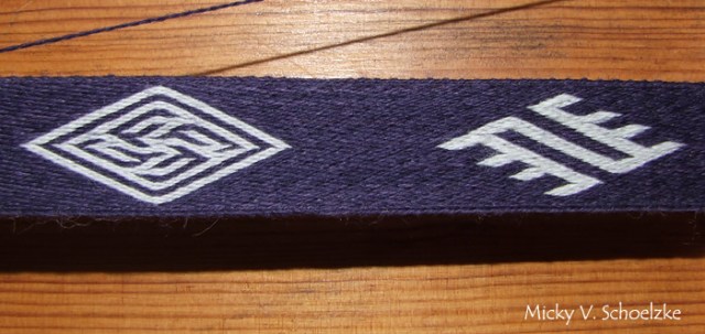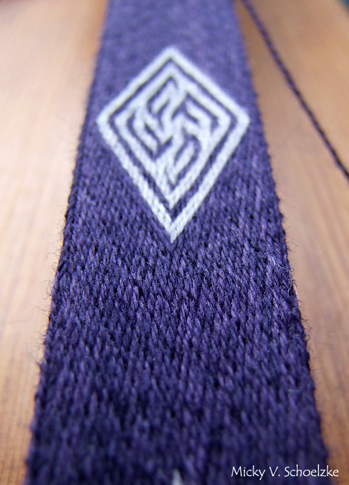 J’ai utilisé dans ces pièces des modèles crées par Eckhardt Garz alias Guntram, que certains connaissent pour son logiciel de tissage aux tablettes. Personnellement, je ne l’utilise que pour les motifs simples et pas pour les diagrammes complexes, j’ai donc imprimé les dessins montrant la direction des fils et refait mes propres diagrammes, ce qui m’a permis de réviser le sergé!