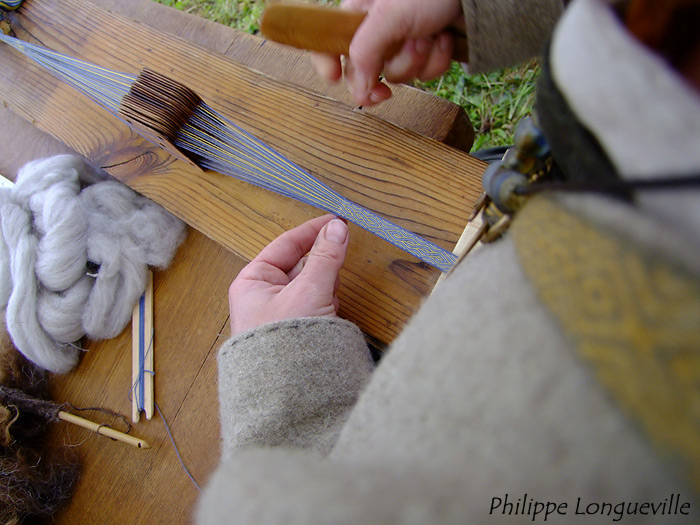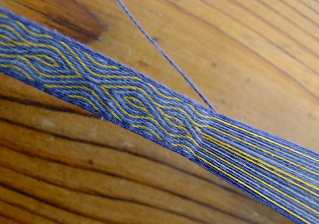 En plus de la teinture végétale, j’avais bien évidemment amené un galon de démonstration pour le tissage aux tablettes, un petit motif inspiré de Birka en soie anglaise (non teintée aux plantes celle-ci!) avec 22 tablettes: