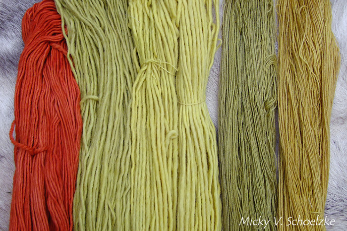 En démonstration, on ne peut pas être aussi précis et attentif qu’à la maison, forcément, donc la garance a quelques taches. Le jaune a été obtenu grâce aux feuilles de bouleau et le vert est apparu lorsque j’ai laissé trop longtemps la laine dans le bain de bouleau sur le feu… Pourquoi? Parce que, contrairement à ce que je fais à la maison, j’utilisais un très vieux chaudron en fonte un peu « piqué » de rouille. A force, du fer va se solubiliser dans le bain de teinture, qui passe d’ailleurs du jaune au verdâtre en même temps que la laine. C’est particulièrement flagrant sur les deux echeveaux de droite!