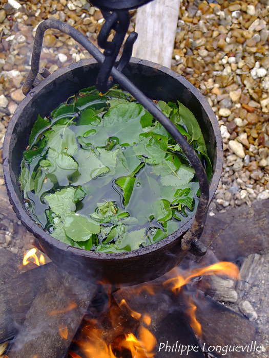 J’utilisais deux chaudrons: un petit pour faire chauffer la teinture, puis un plus grand pour le bain de teinture en lui-même. La racine de garance macérait dans l’eau depuis quelques jours, tandis que les feuilles de bouleau avaient été récoltées la veille.