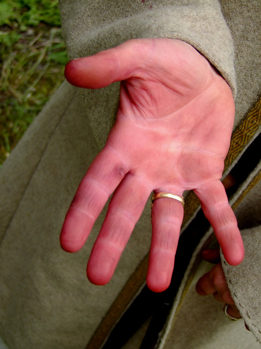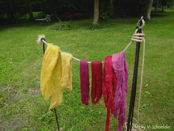 J’ai fait de la teinture végétale; il m’a manqué du temps pour préparer correctement la laine et la racine de garance alors j’ai utilisé du bois rouge (pernambouc)pas très médiéval, certes, mais ça permet au public de voir la teinture assez rapidement. Les nuances tirant davantage vers le rose ont été obtenues par l’ajout de cendres du feu (potasse!). J’ai utilisé également des feuilles de bouleau pour le jaune.