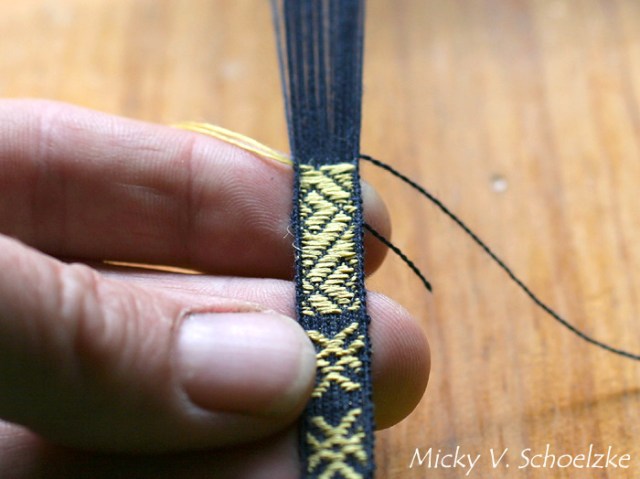 Je suis passée à un motif continu: l’un des motifs retrouvés en Suède, à Birka, pendant le haut Moyen-Age scandinave. Voici ce que ça donne, je commence à être davantage satisfaite du résultat: