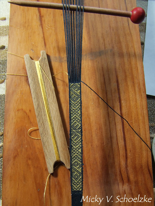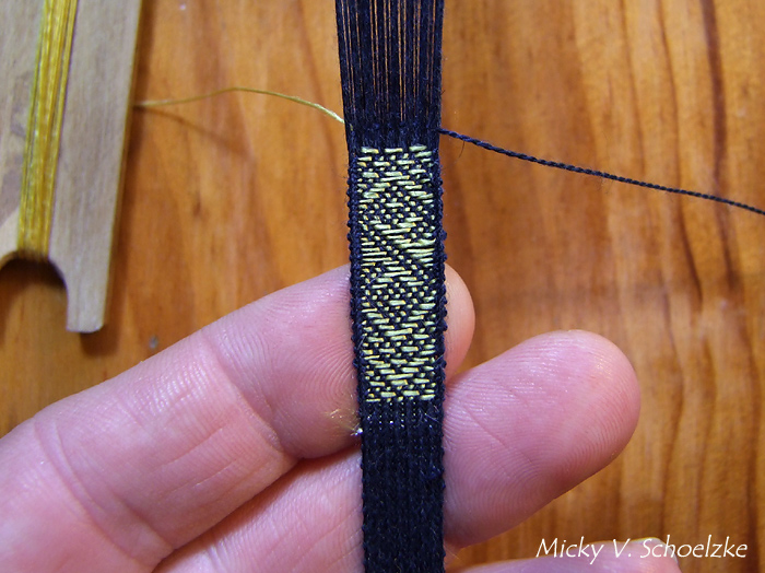 Comme j’aime me compliquer l’existence, j’ai monté une chaîne en soie bleue 60/2 avec 15 tablettes, ce qui me fait une largeur d’environ 8mm… L’enfilage est simple, SZ en alternance. On a donc un tissage aux tablettes uni avec de petits chevrons et on tourne toutes les tablettes dans le même sens. Là où ça devient drôle, c’est qu’à chaque passage du fil de trame, on va passer un autre fil de trame (ici de la soie non retordue jaune) en levant ou en abaissant certains fils de chaîne pour former le motif!