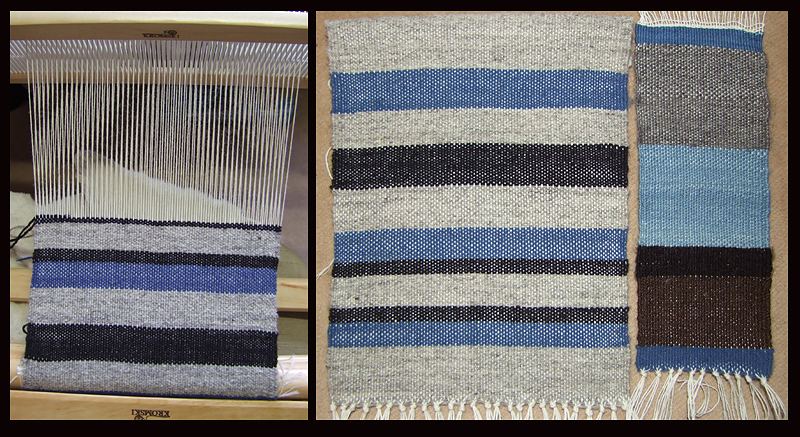 Et voici le résultat de mes premiers essais (à gauche, le tissage en cours, à droite la petite pièce d’essai et la grande):