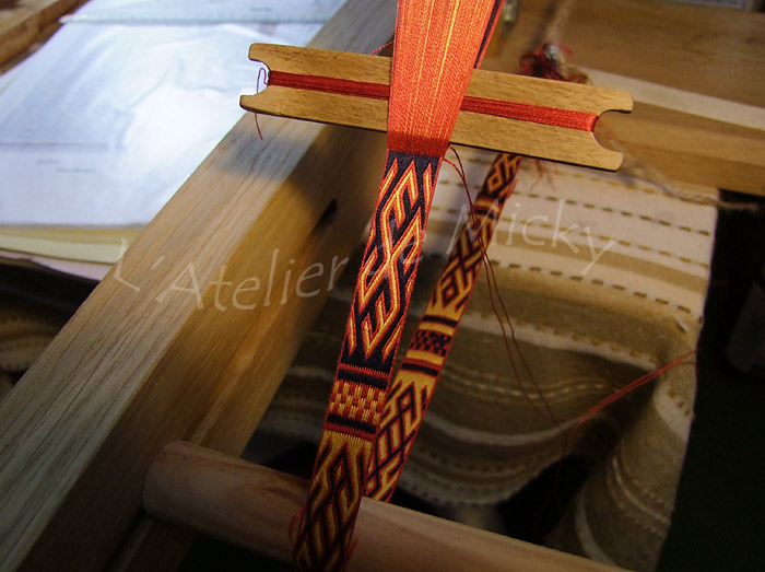 Pour la soie, la tussah sera sans doute un peu épaisse, il y a de très longues sections de fils flottés sur ce galon et il vaut mieux un fil très fin (ici c’est de la soie 60/2, taille « fil à coudre »)