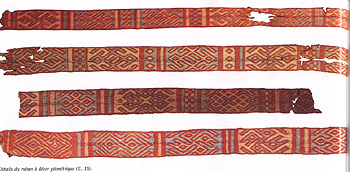 Le plus célèbre de ces galons est une pièce bordant la tunique de Bertille et réalisée en technique « missed-hole », mais ce n’était pas cette pièce qui m’intéressait. Le galon qui m’avait tapé dans l’œil présente des décors géométriques et a été réalisé en soie: 23 motifs en tout sur 4 fragments, encadrés par des séparatifs différents. Les motifs ont été retravaillés par Babette sur son site de diagrammes (Edit: site indisponible!) et on trouve des liens sur ce site également.