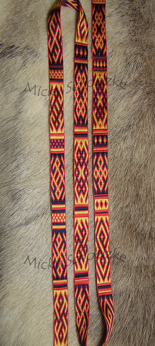 La technique avec ses fils flottés fait penser à une autre pièce de fouille célèbre, Snartemo V, trouvé en Norvège. Les deux pièces sont d’ailleurs vraiment passionnantes à tisser! dès qu’on a fini un motif, on a envie de commencer le suivant!