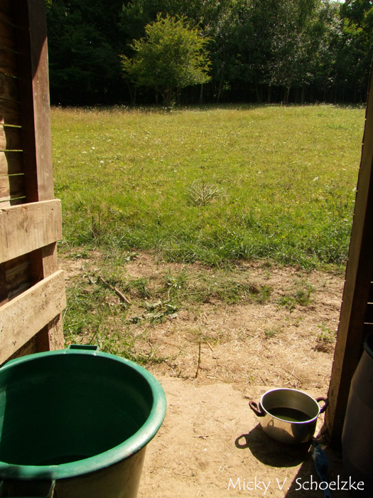 Pour les teintures, je me suis aménagé un nouveau coin, dans la cabane où vivait mon ânesse, qui a trouvé une nouvelle et gentille famille avec plein de copains! Voilà la vue depuis mon nouvel atelier teinture. Sympa, non? Il manque peut-être quelques moutons… 😀