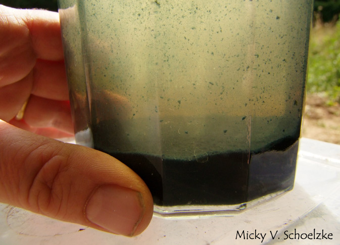 En revenant de vacances, j’avais constaté que mes plants de pastel avaient bien supporté mon absence et qu’ils avaient refait de belles feuilles. J’ai donc procedé à une autre extraction, qui m’a donnée une récolte de pigment plus importante que la précedente !