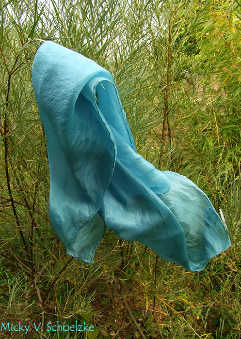 Il restait encore du pigment dans le bain d’extraction, du coup j’ai teinté un peu de soie. Un autre foulard en soie pongée très fine, une échevette de soie floche épaisse et une autre de soie ultra-fine.