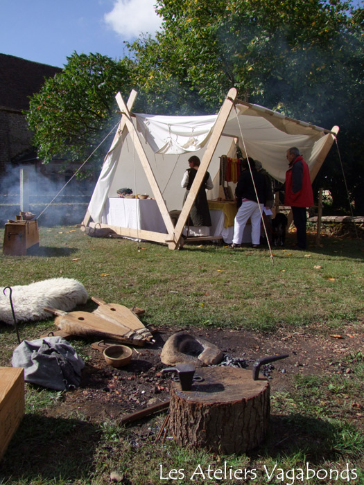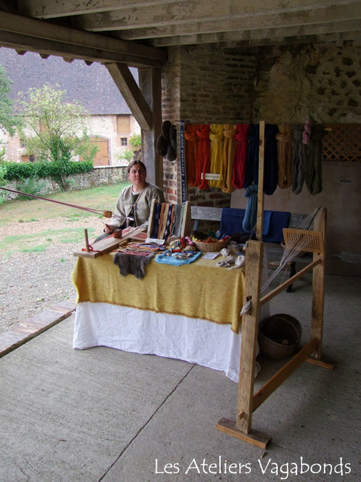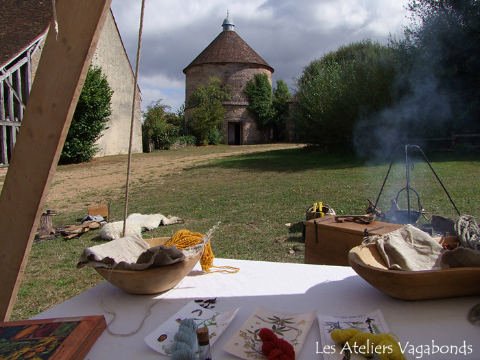 Voilà les images de samedi. Nous n’avons pas pu installer la forge et j’avais mis mon atelier textile sous l’auvent de la grange dîmière.