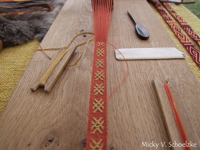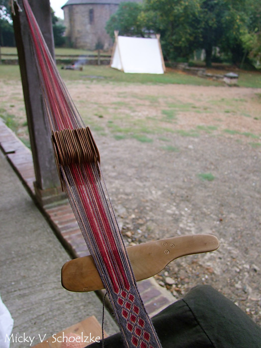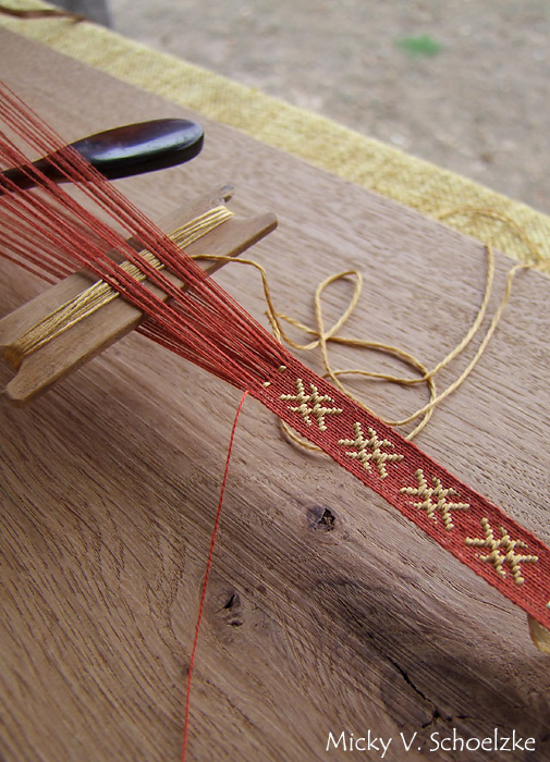 Et voici mon galon en soie broché (teintures garance et bourdaine). J’avais choisi un motif simple du XIIème siècle, en hommage au lieu et j’ai eu le temps de bien l’avancer samedi! Par contre, dimanche, trop d’explications à donner pour tisser sérieusement, c’est toujours très bon signe!
