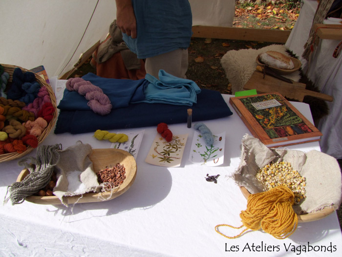 Mon petit coin couleurs végétales, qui a pas mal interéssé le public! Sur notre feu de camp, j’ai teinté avec de la gaude et de la camomille.