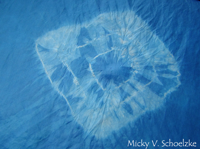On voit très bien que les liens sur le coton ont bien moins laissé diffuser l’indigo! Du coup, je pense que je vais sérieusement penser à donner une nouvelle jeunesse à divers vêtements, nappes ou serviettes… ces deux carrés de coton, je pense que je vais les transformer en sac, avec une jolie bandoulière tissée aux tablettes, celà aurait de la tronche! 😉 Il faudra juste que je laisse tremper plus longtemps ou que je fasse des bains successifs, après séchage, le résultat est un peu clair à mon goût, mais c’est un essai à transformer!