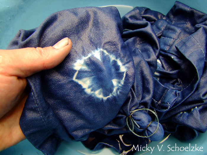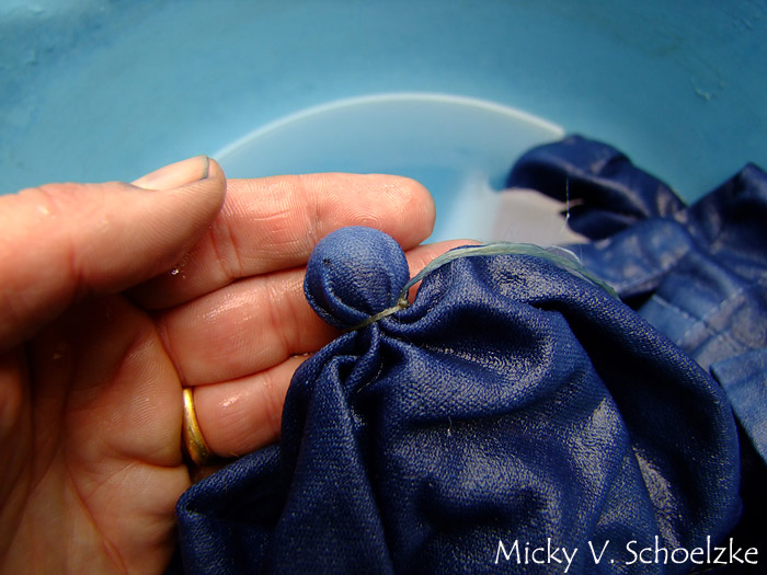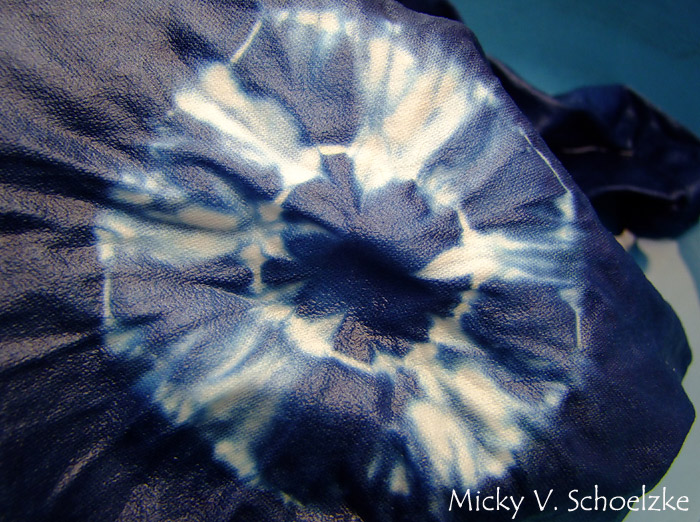 La technique est assez simple et résumée dans le nom anglais. Tie = attacher ou lier et dye = teindre. On attache et on teinte, donc! J’avoue être un peu le nez dans la soie en ce moment, alors j’ai d’abord utilisé mes écharpes en pongé… Ce que j’avais oublié, c’est que l’indigo diffuse bien dans la soie, d’où des résultats peu « francs » mais que j’aime bien:
