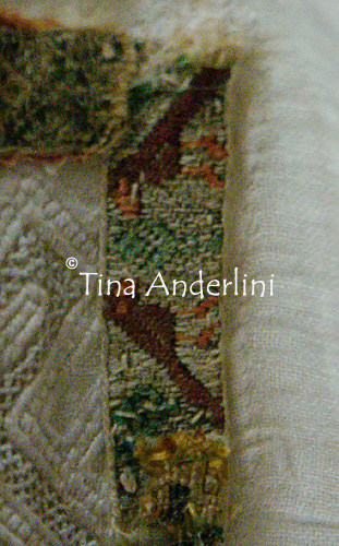 Je viens de finir un petit galon broché qui a été un vrai défi! J’avais pour référence une image d’une partie de l’aube de Saint François d’Assise, avec de petites bordures tissées représentant des formes géométriques et des petits oiseaux (cité dans « le costume médiéval au XIIIème siècle », éditions Heimdal, à paraître prochainement, ainsi que dans le HS de la revue « Moyen-Age » n°40).