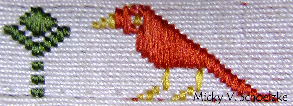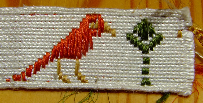 On voit là un certain nombre de soucis, plus ou moins gênants! j’ai eu du mal à obtenir une couverture suffisante avec la soie floche, comme on voit surtout au niveau de la queue de l’oiseau. J’avais également du souci à bien tendre le fil de broché sur le tissage et comme on peut le voir, oublié parfois de le mettre bien à plat.