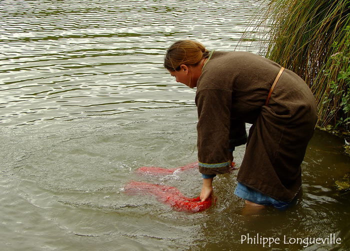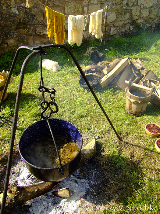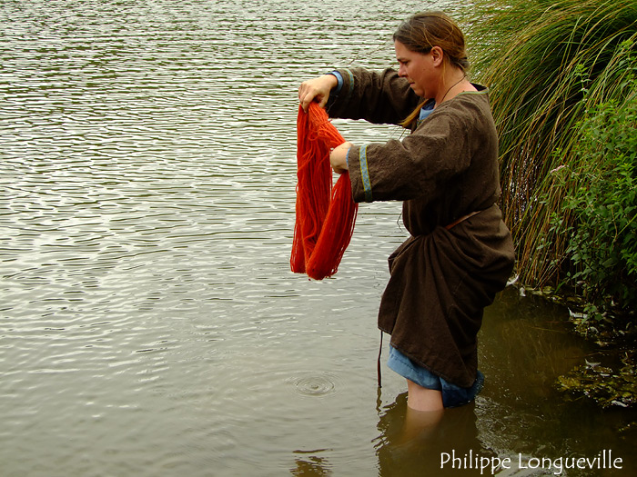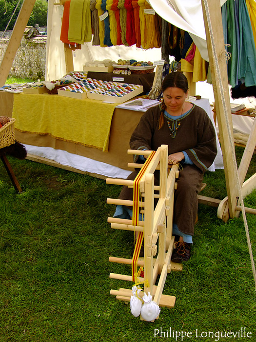 Je m’étais engagée auprès de l’organisation à faire des démonstrations, en échange de l’emplacement de vente: j’apprécie quand des organisateurs proposent cette solution, car les prix des emplacements sont parfois élevés pour des petits artisans comme moi… J’avais donc emmené tout ce qu’il faut pour teindre, mon métier à tisser et ma « mallette pédagogique » textile! Isabelle avait emmené de quoi broder, c’est d’ailleurs assez rare de la voir sans une broderie dans les pattes ou à portée de main… 😉