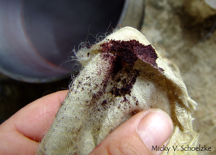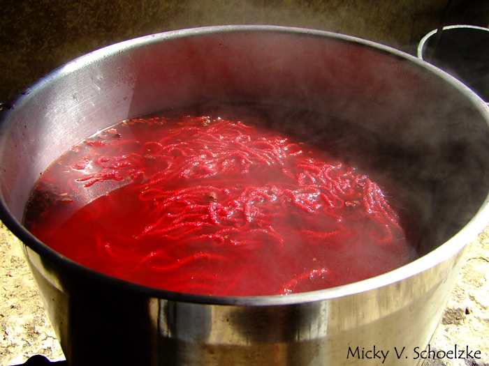 One needs a fair amount of dyeing material for this recipe: for 500g of wool, I had 125g of cochenille. First, the little dried critters are crushed then mixed with water and cream of tartar (10%) and left overnight. The next day, this is boiled about 20 minutes, before getting rid of the « tar » on the surface. The remaining cochenille powder is filtered and put into a dye sack (I use a piece of an old curtain).