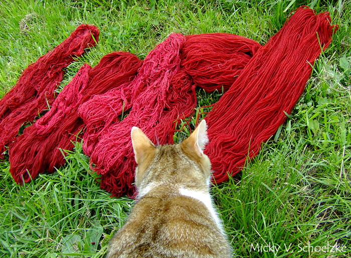 The skeins still wet, inspected by my cat… For this tibetan red, I used 2 skeins of Macomerinos (a french breed), one of merino, one of merino and silk and one of mulberry 20/2 silk. I also dyed a silk scarf.Yes, only precious fibres for this test: call it either confidence in the recipe or plain folly…