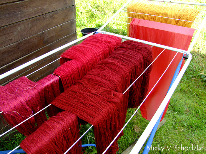 I used the bath again by adding some more 10% of madder and dyeing 2 skeins of 1-ply wool and another skein of thicker Macomerinos. Here is everyone happily dryeing. The orange in the background was dyed while watching my reds with chamomile and madder.