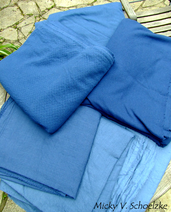 Il n’y a pas que les écheveaux dans la vie, j’avais aussi plus d’une vingtaine de mètres de tissus à teindre en indigo! On me demande très souvent d’autres couleurs, mais pour le moment j’en reste à l’indigo. Pourquoi? tout d’abord parce que pour des couleurs comme le jaune ou le rouge, il est nécessaire de garder le bain de teinture à chaud et je ne dispose pas de cuve assez grande pour y teindre 3m de laine. Ensuite, si je commence à avoir une habitude de l’indigo et quelques connaissances pour la teinture en écheveaux, ce n’est pas pour ça que je sais tout faire, loin de là. Passer à plus grande échelle nécessite selon moi une logistique différente mais aussi une expérience que je n’ai pas encore acquise. Alors autant faire bien ce que l’on sait faire! j’en reste donc à l’indigo. Pour avoir une idée de ma façon de faire (très artisanal, mais c’est le résultat qui compte!!), vous pouvez regarder cet article de 2013.