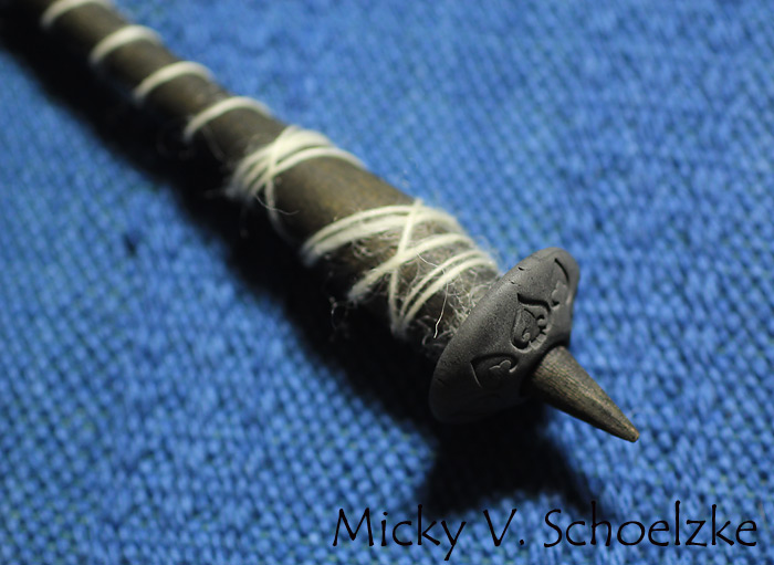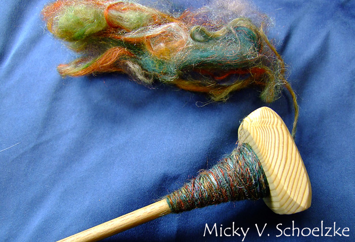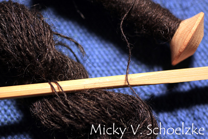 A mes débuts, j’avais acheté un fuseau à main pour savoir montrer la technique au public quand je fais des animations, mais je n’étais absolument pas douée pour ça, préférant de très loin le rouet! C’est lors du Forum Textile Européen en novembre dernier qu’on m’a vraiment montré comment faire et me dépatouiller un peu mieux. A cette occasion, j’ai constaté que mon fuseau était à la fois trop lourd et ne tournait pas super bien… je ne risquais pas de m’en sortir avec cet engin sans aide extérieure en fait!