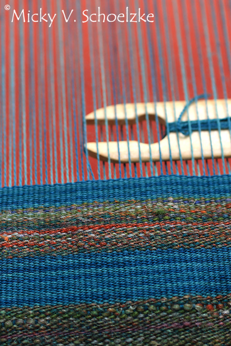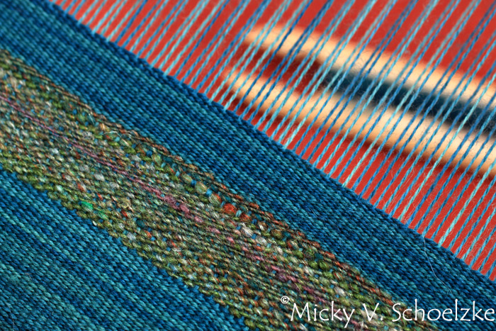 Comme j’avais hérité d’une magnifique nappe cardée, j’ai filée celle-ci au fuseau et j’ai gardé ces fils célibataires pour m’en servir dans un tissage sur mon métier à peigne envergueur, que j’ai enfin eu l’occasion de réutiliser! Je l’avais négligé, ce petit…