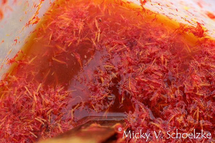 I washed 200g of dried flowers for a long time, pressing and crushing the material. I kept the first 2 baths, which had a beautiful saffron colour in order to dye some silk with it, even if safflower is not supposed to be very light fast. The smell is very nice, flowery and sweet like honey!