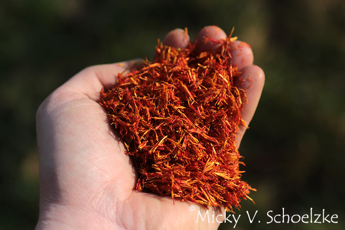 What makes Safflower quite unique are the chemicals of the dyestuff found in it. Its most sought-after ingredient is carthamin, a red pigment which is soluble in strong alkaline solutions only. Other compounds of the plant produce yellows. According to Cardon, Safflower contains 25 to 36% yellow molecules and only as little as 0.3 to 0.6% of carthamin! Carthamin was very precious and has been an important source for red or pink on silk dyeing.