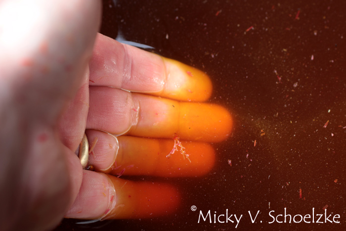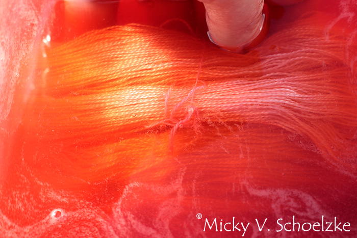 Ensuite, dès que mon eau de lavage est devenue très pâle, j’ai préparé un bain alcalin en y ajoutant de la potasse. Niveau pH, on était aux alentours de 11. Là aussi, s’en est suivie une longue séance de « triturage » et pressage, pour extraire le maximum de principes colorants. Le soir commençait à tomber et mes poignets à fatiguer, alors j’ai remis la teinture proprement dite au lendemain. Mon bain était orange vif, mais dès que j’ai ajouté la fibre puis fait « virer » le bain en y ajoutant du vinaigre, la teinte s’est vraiment intensifiée vers le rouge. A ce stade, le pH était redevenu très acide (4-5 environ). On peut aussi se servir de jus de citron pour acidifier le bain. Mon écheveau de soie rosissait à vue d’œil!
