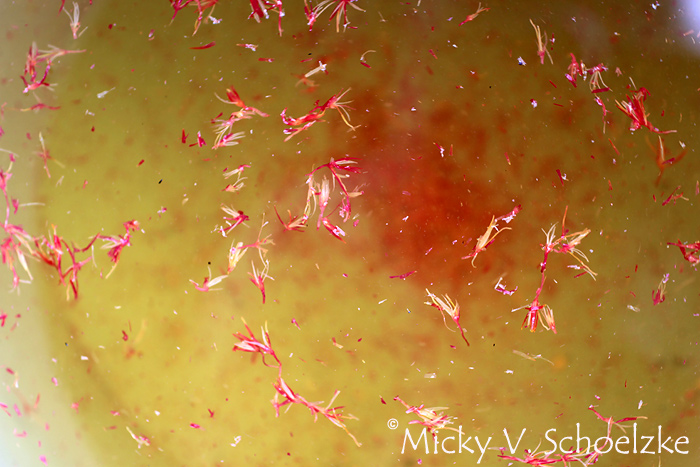 As soon as my washing bath was very pale, I prepared an alkaline solution by adding some soda ash and getting a high pH (towards 11). Again, there was some crushing and pressing to be done to extract the red… Evening was coming and my hands had become tired, so I stopped and went back to my bath the next day. The bath was bright orange and when I added the fibre and some vinegar, it turned red. The pH was back to 4 or 5 by then and my silk skein soon started to turn pink.