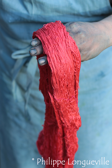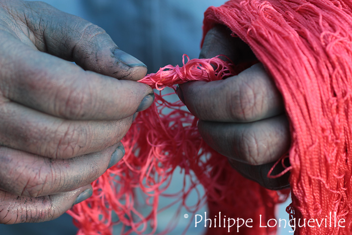 Extracting carthamin requires time and a huge amount of physical work, as the flowers have to be washed and washed to remove the yellow compounds. They are then soaked in an alkaline solution to extract the molecule. Once the fibre is dipped into this bath and the pH lowered by adding lemon juice or vinegar, the carthamin bounds with the fibre.